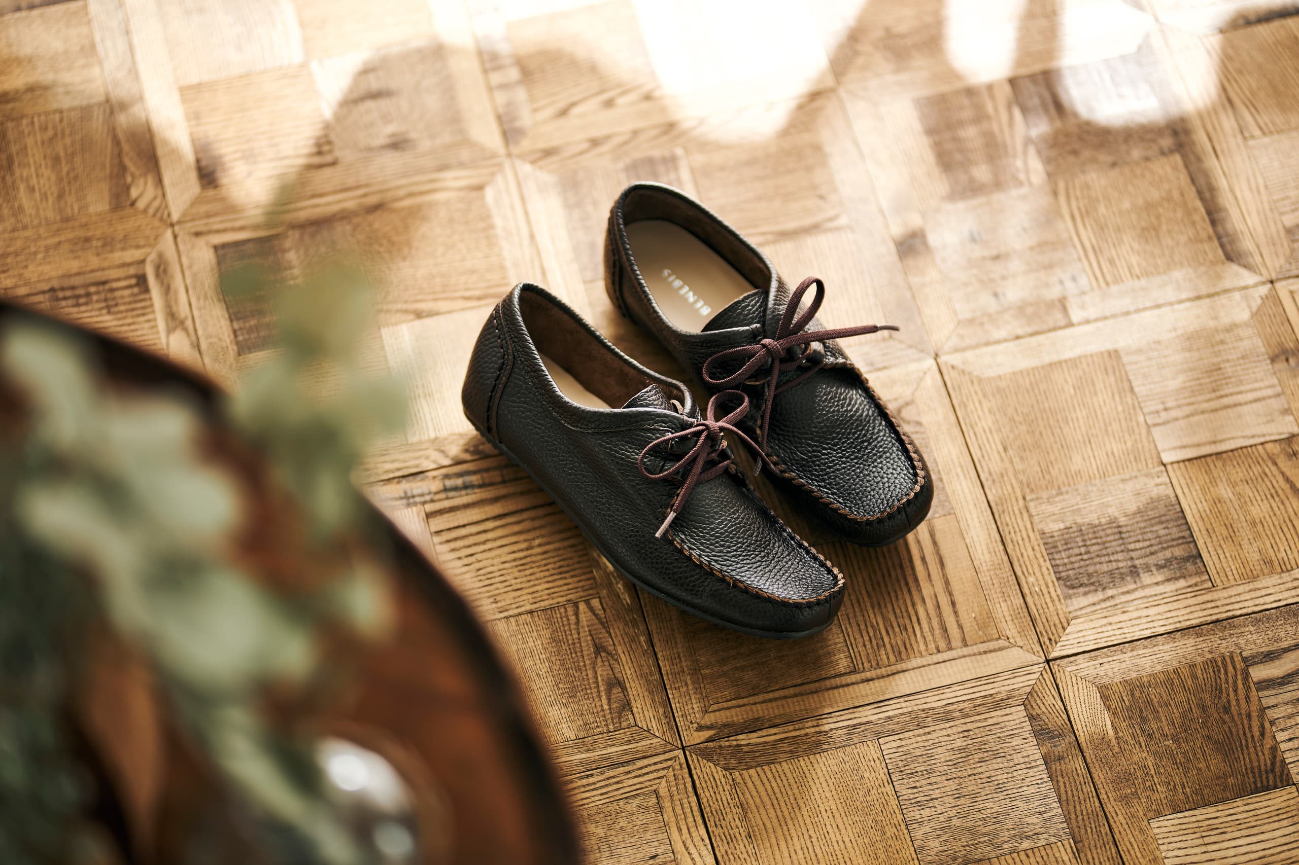 この靴を履いて出かける場所、あるいは帰宅して靴を脱いだ瞬間に感じる「安らぎ」というブランドの世界観を、