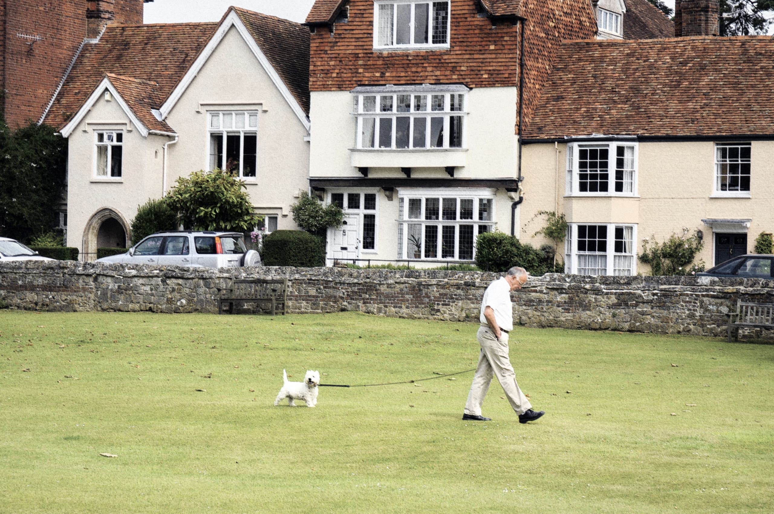 曇り空の下、静かな住宅街を歩く紳士と白い犬。そこにあるのは、劇的なドラマではなく、淡々と、けれど丁寧に積み重ねられた日常の美しさです。